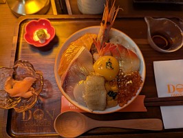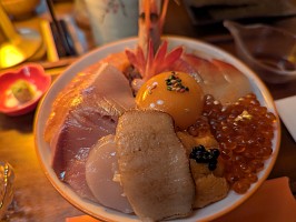 早速、醤油にワサビを解いて、丼にかけました。そして、食べました。口内に満ちる刺身の風味。漁港ある産地レベルで抜群の鮮度とは言えないけれど、及第点の美味しさです!くぅ~、マレーシアにて刺身が食べられるなんて。なんてすばらしい世の中なんでしょう。しかし、しかし、で何か違うぞと!? なんとなんとで、ご飯が白米ではなく、味付けご飯じゃないですか~!あぁ~!あぁ~!何故に白米でなく、味付けご飯?メニューのどこにも、ご飯の種類選択はなかった気がするので、選択肢無しの味付けご飯ですよ…。何故に!?ここだけ、ローカル化した感じなんですかね?残念ながら、刺身の風味をダイレクトに味わうことができず、別の味が混じりこんでしまって、ちょっと残念なのでした(どういう意思決定を経ての結果なんですかね)。まぁ、美味しい丼にありつけだけでも、良しとしましょうかね。 |