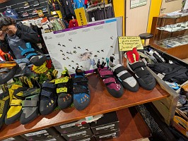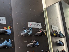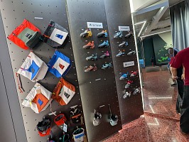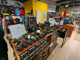 同僚が履きやすそうな靴を選んで試着を始めました(さすがに、sportiva katanaやsportiva skwamaを選ぶことはなかった)。で、2つほど試着をして、良い感じのシューズを見つけたようです。「もう、これを買おうかな」という意気込みだったけれども、せっかくだから下のフロアにあるジムに置いてあるシューズも確認してから、決断しようと提案するのでした。 |