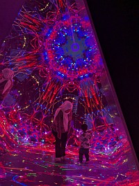 | Zone 7の説明 Roam the illuminated triangular paths and watch the world unfold into a technicolour spectacle. Brimming with vivid levitating objects and rippling waves, watch this reflective space break the barriers of reality. |