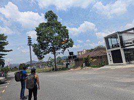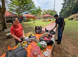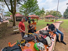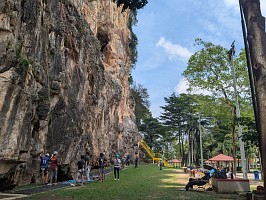 | 自分が2本目を登る辺りから、辺りで鳴り響き始めた雷。こりゃ、一雨来るんじゃないかと、早々に荷物を片して、着替えも済ませるのでした。メンバーも荷物を整理したのだけれど、結局雨は降ることなく、雷の音と、どんより空模様だけで難を逃れるのでした。 すると、後からやって来たMr. Pnのクライミングビレーを、回収隊長Mがしてあげたり、シンガポールチームの3 Brothers(6b, 22m)アタックを眺めたりするのでした…。おかげで、自分はその間にも、更に2,3か所も蚊に刺されてしまいましたよ。Mr. Gが引き上げるとの事なので、Gombak駅まで送ってもらう事にしました。回収隊長MとMr. Svは、もう暫くクライミングをして帰るようだぞと。 |