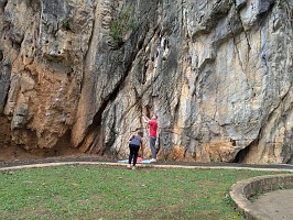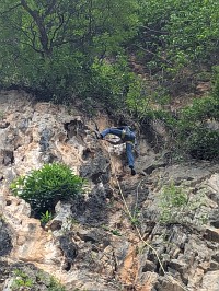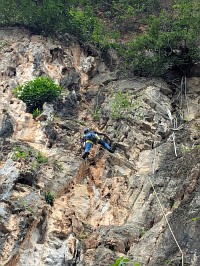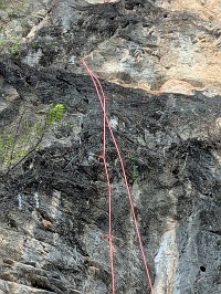 | 我々は、その右横にあるBrothers love climbing(6a+、32m)にトライしました。Mr. Svがマスターオンサイトで、クイックドローをかけて行ってくれます。途中、ブッシュを左巻きでやり過ごすところや、核心箇所でちょっと時間かけていたけれど、問題なく完登でしたよ。自分もその後にトライしてみてびっくり。6a程度かなと言う意識だったのだけれど、結構難しい!後で聞いたら、6a+との事で納得ですよ。久しぶりの外岩&指の怪我からの復帰後とも相まって、苦労するのでした。Mr. Sv以上の時間をかけて登りましたよ。 |