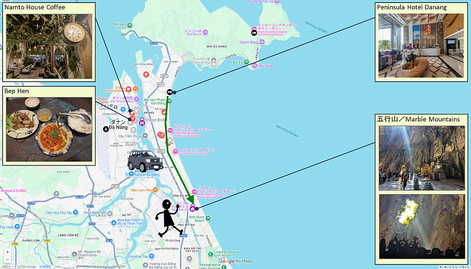 | 本日のざっくり予定は、五行山(マーブルマウンテン)なる岩山にあるお寺を巡るのがメイン企画。巡り終わったら、ホテルに戻って宿泊に付帯しているアフタヌーンティーでランチを頂くことにしよう。後はまったりしつつ(歩き疲れているだろうし)、晩御飯に出かけるというもの。とりあえず、テクテク歩くぞ~。 |