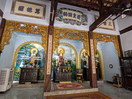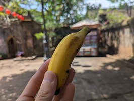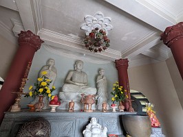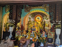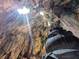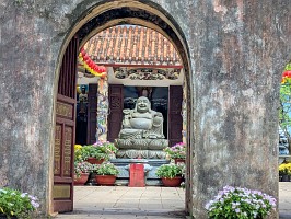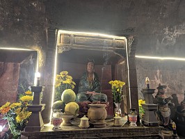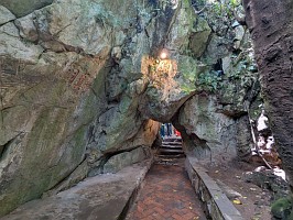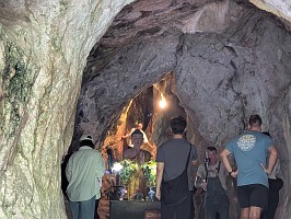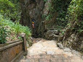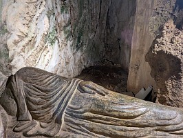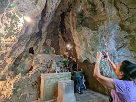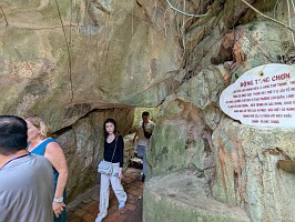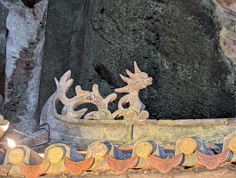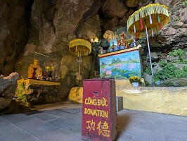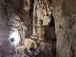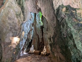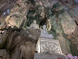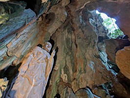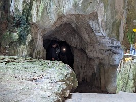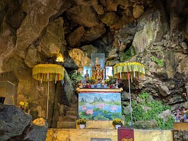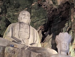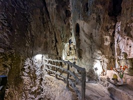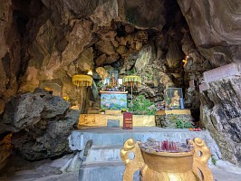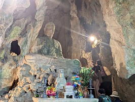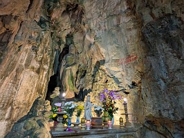 | これも、AIに聞いてみました。 ----- 横たわった涅槃仏は、実は五行山の仏教史においては比較的新しい存在です。ベトナム戦争(1975年終結)直後、1977年に戦後の復興と平和を祈念して、洞窟の最奥部にあるわずかなスペースを切り開いて安置されました。元々あった地形に合わせて作られたため、洞窟壁面ギリギリの配置となっています。 |