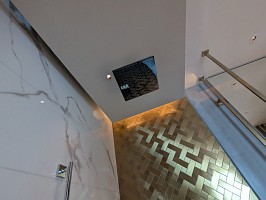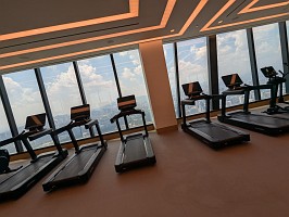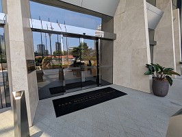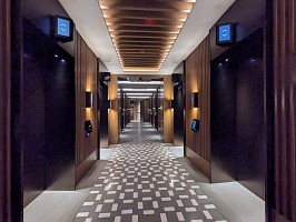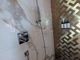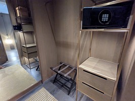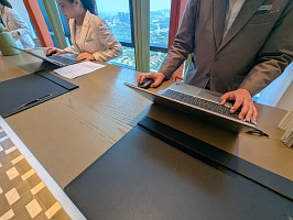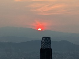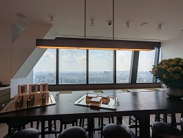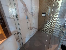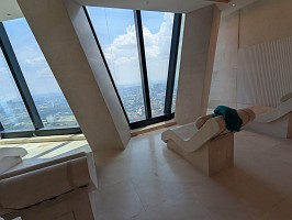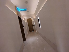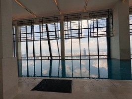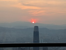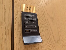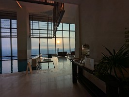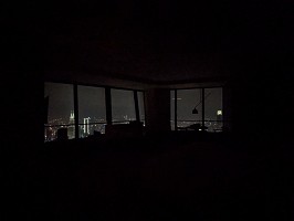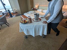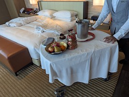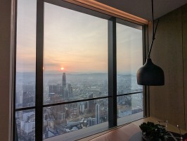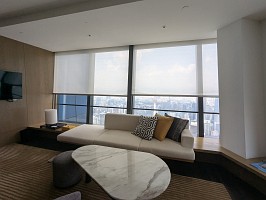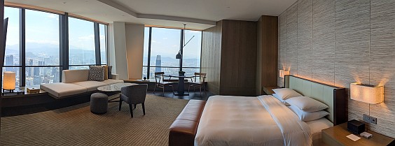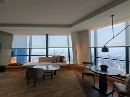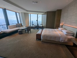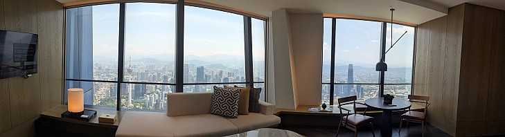 | 受付してくれたスタッフが、そのまま部屋まで案内してくれました。テクテク案内されて、部屋へと辿り着きました。で、部屋に入るとドバーン!と広がる景色がそこにはありました(案内の途中であったことと、驚き・興奮のため、この時の写真は撮っておらず)。景色は変わらないので、追って写真掲載です。室内設備の説明を一通り終えて、スタッフが退室しました。さてとで、改めてで撮影しよう!角部屋で広くて凄いわ~。 |
