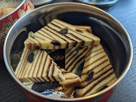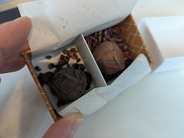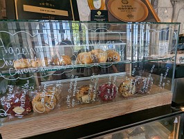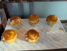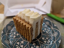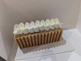 | こんがりパイ生地はパワー不足にして、クリームも少々少なめですね。それと、クリームは形が崩れないよう配合も変えているはずです(少々固めだったし)。これはこれで美味しいのだけれど、店内用と食べ比べちゃうと味わいが全然違うのでした。 とはいえ、トリッシュとプレゼントしてあげた友人は、クリームがボリュームあり過ぎて、テイクアウト用の方が好みだとの事でした。この辺は、人それぞれで、好みも違いますね。いずれにせよ、こんなにも味わいが違うとは、なのでした。正直大きな違いとなっているので、どちらも是非とも試してほしい一品です。 |