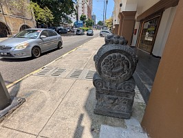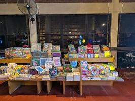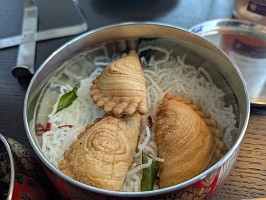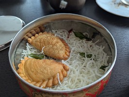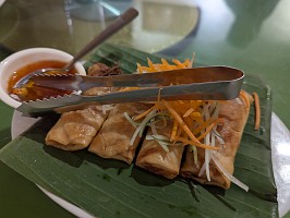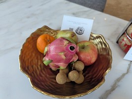 | スイーツの方は、時計回りに、ミカン、洋梨、リンゴ、ランサ(ドゥク・ドコン)、ドラゴンフルーツでした。フルーツは、自宅に持ち帰って食べさせてもらいました(旅行者でなく、在住者の強み)。ミカン、洋梨、リンゴはボチボチでした。ランサ(ランサ、ドゥク、ドコンと種類があるみたいで、どれがどれなんだか)は、簡単に剥ける皮の中には、ライチのような実が入っています。こちらは、以前に自分が買ってみたものよりも甘くて美味しかったです(自分が買ったモノはグレープフルーツの様な、甘みと酸味)。それでも、ライチの方が美味しいかな。ドラゴンフルーツも、熟し方が足りず、イマイチな感じでしたよ(もう暫く追熟で置くべきでした)。でも、高級なドラゴンフルーツ(白)タイプでした。 |