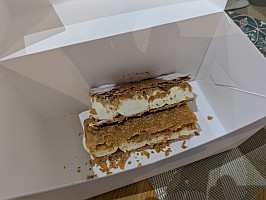 | ほんのりわずかに感じるチーズの風味とバニラビーンズを感じる生クリームが、こんがり焼かれたパイ生地と相まって、美味しさ悶絶ものです。これは、本当、美味いわ~!さすが店内用とあって、テイクアウトのモノよりも美味しさを感じます。これは、本当マストなミルフィーユ!是非とも味わっていただきたい一品です。あ~、本当、マジ幸せ♪ |