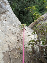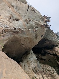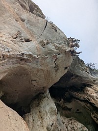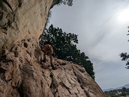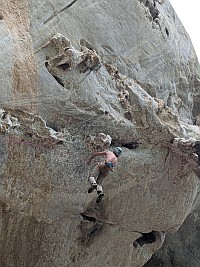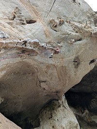 | 『やってみる?』と言われて、途中までだったら行けそうなのでやってみました。が、彼が次にトライするときに、省エネモードで行きたいとの事で、5クリップまでのトップロープです。しかも、アンクリップしないで登る方法です。被り壁だけに、、失敗したら物凄いスイングさられるという事…。口うるさいガイドとかだったら、『危ないだろ!』と怒られそうな登り方。とりあえず、5クリップまで無事に登り進めることができたので、大きく振られることはなかったけれど。 5クリップ箇所でテンションしたときに、カラビナとボルトリングの金具同士がこすれる音がするのでした(カリカリカリ~っと)。高所は怖いし、嫌な音はするし、それなりに振り子状態になっているしで、早く降ろしてほしかったです。気を利かしたMr. Qが、『もう1度トライする?』と聞いてくるのだけれど、戻るのは厳しいし、怖いしで『早く降ろして~!』と。本気で怖がる様子に、『怖かったんだね、直ぐに降ろさずに、ごめんよ』と謝ってくれましたよ。 そのあとに、もう一度、Mr. Qがトライするけれども、やっぱりさっきの所から先に進む事ができず。断念。いったんスタート地点に立ち寄って自分の靴を抱え、そこから下まで降りていきましたよ。ちなみに、後日に連絡があって、無事にBelly Button Windowを落とすことができたよとの事でした。正しいムーブが分かれば、それほど難しくないとの事でした(でも、7b+ですからね…)。 |