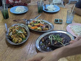 | ちなみに、自分が魚料理を食べない日が続いた2日間。『魚は嫌いなの?』と聞かれて、返事に困り(日本での魚を食べていると、こっちの魚はどうにも食べる気になれず)、『海の魚は食べるけど、川のモノはあんまり食べないんだよね』と答えたのでした。『そうだったの?じゃあ次は魚料理を見送ることにするよ』と気を使ってくれるのでした。一応、『いやいや、魚料理、頼んでよ!』と返したのだけれど、本日の晩御飯に魚料理は出てきませんでした(皆、ごめん!←多分、魚料理は好きだと思われる)。 なお、2日目の時には、『これは川魚ではなく、海魚だよ』と言われてしまったのでした。「ぐぇ~!」と。とりあえず、一口食べたけれど、決して美味しいとは思えずに、それ以降、箸は進みませんでしたよ…。そんな経緯があって、本日のオーダーメニューとなりました。 |