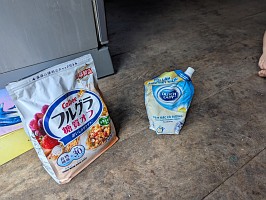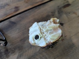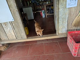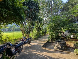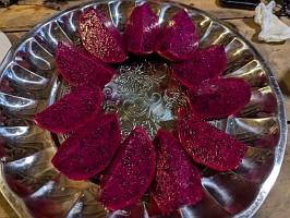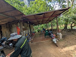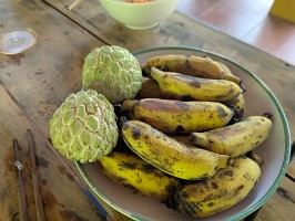 | カスタードアップであったか。以前に、カットフルーツを買ったことがあったよ。丸ごとは初めてなので食べ方が分からず、まごまごしていると、Mr. Hが教えてくれました。外の柔らかい皮を指で剥いて(簡単に剥ける)、白い実を食べます。種が非常に硬いので注意。味は、ほんのりカスタードっぽさと洋梨を足して2で割った感じでしょうか(美味しい)。Huu Lungでは、あちこちで栽培されていて、米とカスタードアップルが主な農産物の様でした。 |