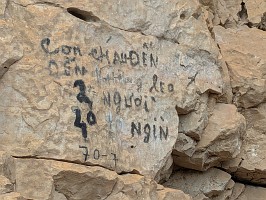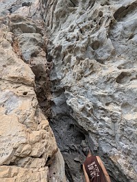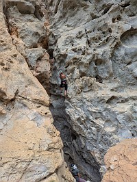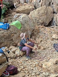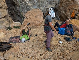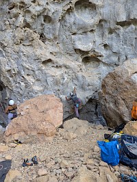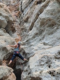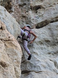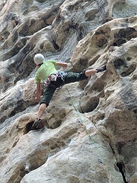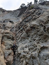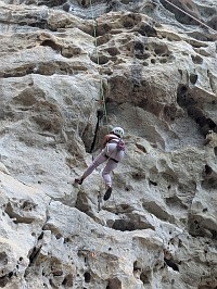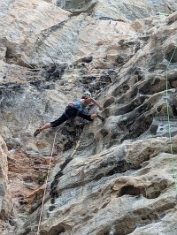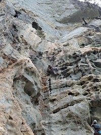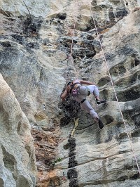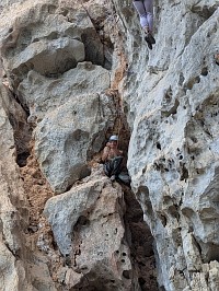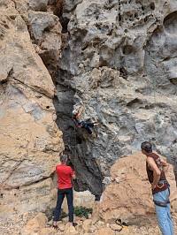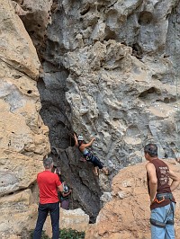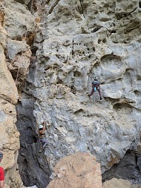 体力温存に気を使いながら、慎重に登り進めていきました。途中の小テラスで、休憩もできますよと。しかしながら、少しずつ体力が削られているのは間違いなかったようです。1か所だけの核心箇所で、縦のカチホールドから、あまり良く無いホールドを3つ4つ、繋いでいかなければならないのだけれど、なかなかにドキドキのムーブ。自信が持てなくて、まごまごしていたら、体力尽きてしまったのです。 休憩後、意を決して突っ込むことで突破できましたよ。6b+レベルだと、あれぐらいのホールドをちゅうちょなく突っ込んで行かないといけないんだな~と改めて思うのでした。できるだけ、楽に登りたいゆえに、良いホールドを探して撃沈と言うのが多いけれど、その辺の見極めが外岩での初見は難しいなぁ。ついでに核心を越えてクリップする際に、足上げのポーズになったゆえに腰のクイックドローが、取り出しにくいのなんのって。たすき掛けでギア装着できるアイテム、持っていたなぁと思い出しました(日本に置きっぱなしだよ)。 ところで、登り終えてグッタリ疲労困憊モード。暑くて暑くて、汗かきまくりだし、女性陣がビレー、クライミング、クライミングと3名とも作業に取り掛かっているのを確認してから、パンツ一丁姿になって涼モードに変身しましたわ。でも、その姿をビレーヤーに見られてしまったましたわ(話のネタにあがるのでした)。暫くしてズボンを履いたものの、グッタリモードは解消されずで、本日は1本のみのクライミングで、後はゴロゴロ&仮眠をしたり、写真撮影&ビレーをして過ごしてました。 |