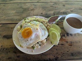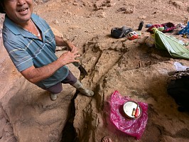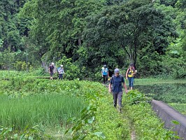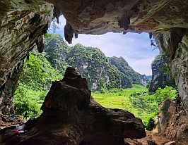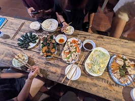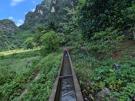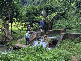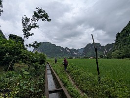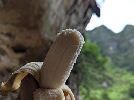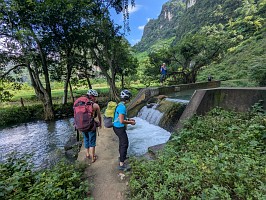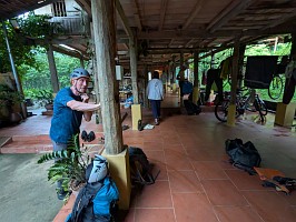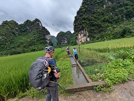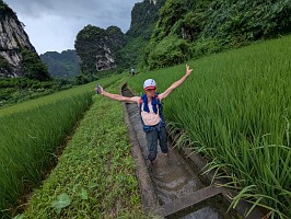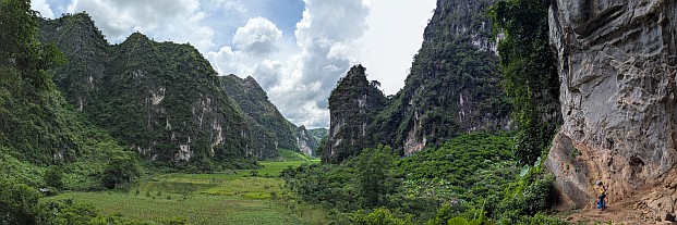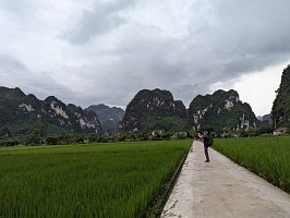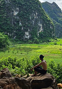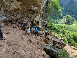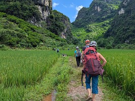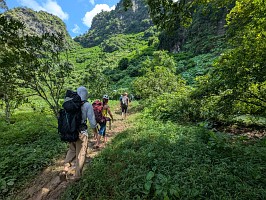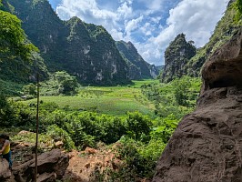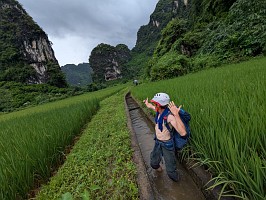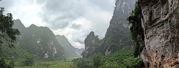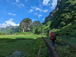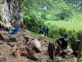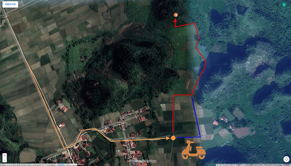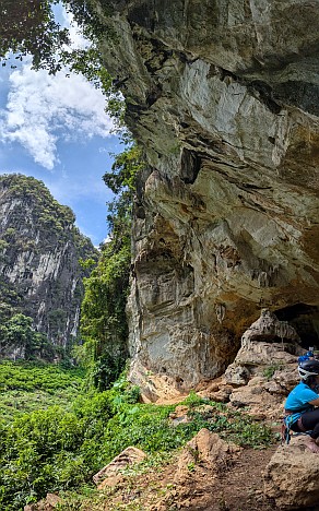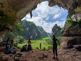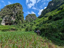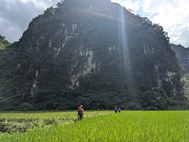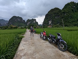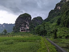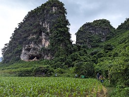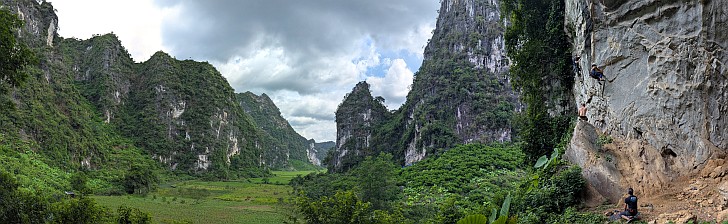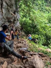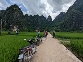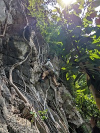 | 本日はクライミング最終日。宿を一緒するアメリカ人Mr. Cは、あまりレベルが高くないので、我々のグループに毎日参加は見送っていたのでした(彼はレスト日も設けていたし)。で、本日の参加を聞いてみると、『君たちの最終日だろ?参加しなわけにはいかないよ』と粋な返事が返ってくるのでした。 よって、8名でのクライミングお出掛けとなりました。ちなみに、行先はInfinity Caveに決定したのでした。昨夜にMr. Hからアクセス試みるバイクルートが共有されました。今になってサイト掲載のためにGoogle mapで探してみたけれど、見つける事ができないと判明。衛星写真から判断して、ここだここだと、今になってマッピングしたのでした(本当、おんぶにだっこのツアー参加なのでした)。 ※Huu Lungの岩場の全体マップはこちら。 |