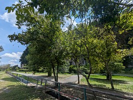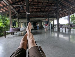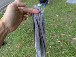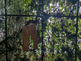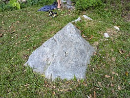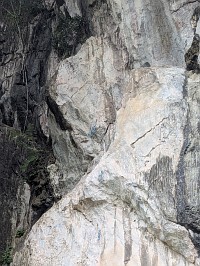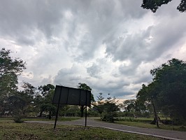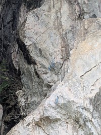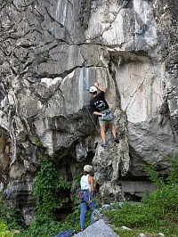 | 久々の外岩とあって、Ms. Cmは回収作業を見送り。再び大食漢Tが、Spicy(5c, 17m)へと取り付いて回収作業をするのでした。すると、大食漢Tが登っている途中で、スコールがやって来ました(やはり、空模様で危惧した通り)。登っている大食漢Tよりも、ビレーをしていた自分がびしょぬれ状態に…。短時間ではあったけれども、多くの岩が濡れてしまったのでした。濡れていない壁は、どこも難易度が高すぎて見送りすることに。という訳で、1本だけ登って撤収となりました。自分は、2回訪問していて、計2回しか登っていないという有様ですよ。 |