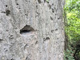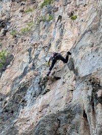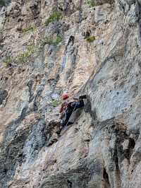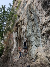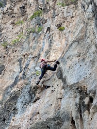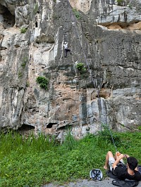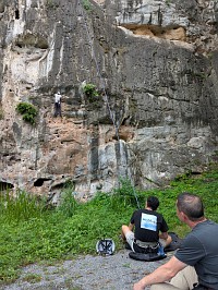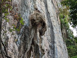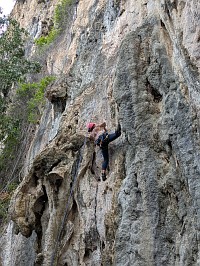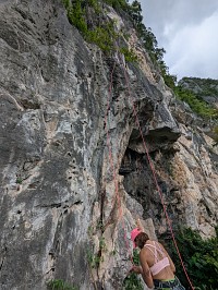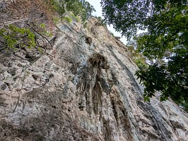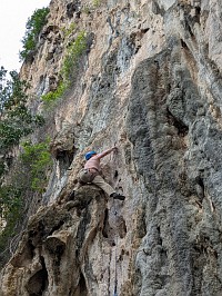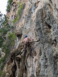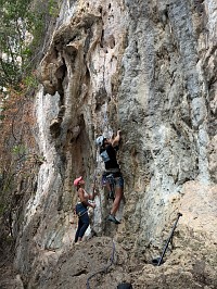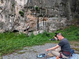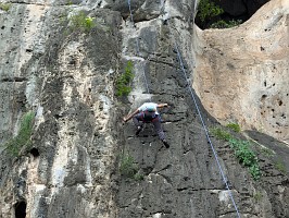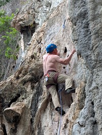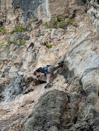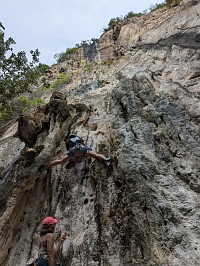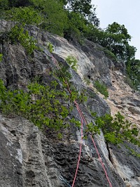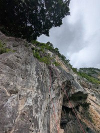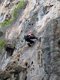 | 最初にGajah(6a, 28m)を、回収隊長Mに先発でMOSしてもらいました。自分は、少し考えて、久しぶりのトップロープで完登して回収作業しましたよ。その代わり、次のルートは自分が先発でリードクライミングすることにしました。 |