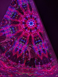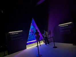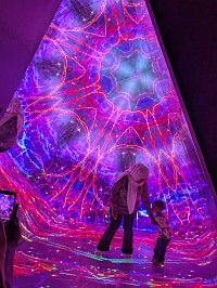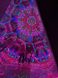 | Zone 7の説明 Roam the illuminated triangular paths and watch the world unfold into a technicolour spectacle. Brimming with vivid levitating objects and rippling waves, watch this reflective space break the barriers of reality. |